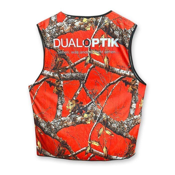 Die äußerst hochwertige Treibjagdweste in der Signalfarbe rot-orange schützt jeden Treiber und jeden Schützen vor vermeidlichen Jagdunfällen, da die Farbe im Unterholz sehr gut zu sehen ist. Bei Gesellschaftsjagden schreibt die Unfallverhütungsvorschrift (UVV) vor, dass jeder Teilnehmer rote Warnkleidung tragen muss. Die Signal-Weste ist mit einem aufwendigen 3D-Wildmotiv bedruckt und am Rücken ist das Dualoptik Markenlogo aufgedruckt. Erhältlich mit Druckknopfleiste oder Reißverschluss.