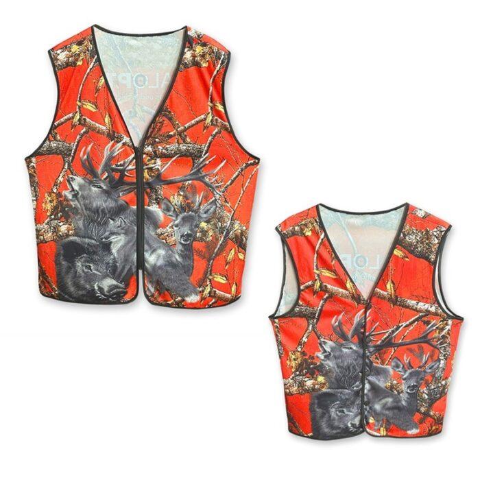 Treibjagdweste in Signal-rot-orange mit 3D Wildmotiv, zum Überziehen über die Jacke, mit Druckknopfleiste oder Reißverschluss. Günstiger durch Staffelpreise.